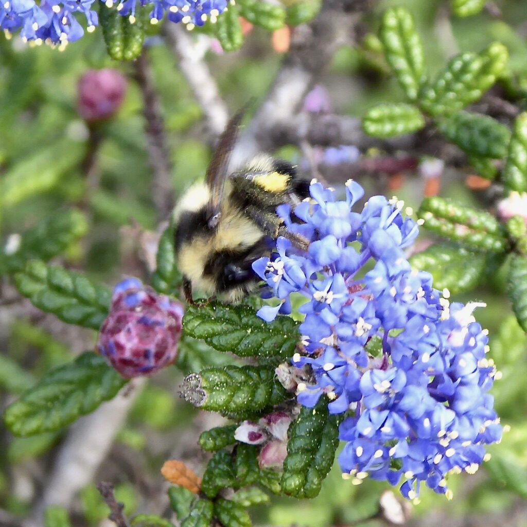 1. I have been doing a lot of tending of my garden (a common occupation nowadays, I bet), and in the process of clearing away some brush, I discovered that bees had made a home under a heavy flagstone. I’m quite sure they are bumblebees, being black and yellow, fuzzy, and practically spherical; and from observing them I can tell they’re social and, obviously, ground-nesting. But I haven’t seen one settle on a flower or do anything else slow enough for a photo, much less close examination, so I can’t identify the marks that would tell me the species. I’m just delighted they’re here.