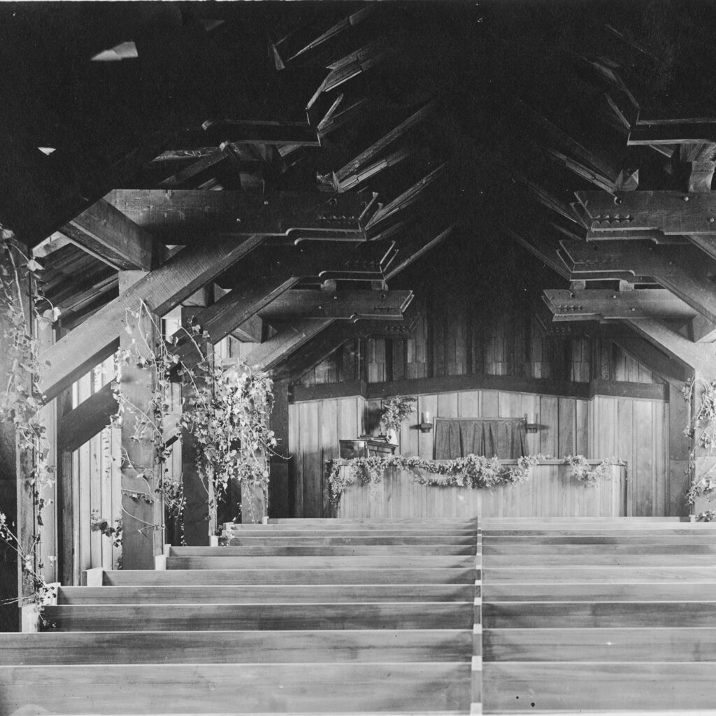 “The aisles of the church are along the sides, the pews running solid through between two rows of posts, which form the main support of the building. From these posts and from the posts set in the side walls run heavy beams clear to the roof tree. The roof spaces between the beams are covered with shakes down to the walls, where the boards and battens begin. The chancel arch is the denominating feature of the interior. It is, as already stated, as high as the roof, and is massive like the rest of the structure. The pulpit stands directly under the center of the arch, three or four steps higher than the lower level of the church floor.
