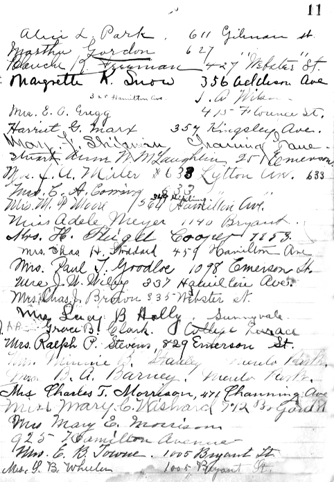 Just two weeks later, on October 23, the women formed their own Unitarian organization. The Women’s Alliance, formally known as the “Branch Alliance of the Unitarian Church of Palo Alto,” became a local chapter of the National Alliance of Unitarian and Other Liberal Christian Women. How did the Palo Alto women decide to form their own Branch Alliance so quickly? Perhaps George Stone promoted the idea. The national organization existed to “to quicken the life of our Unitarian churches,” which would have suited Stone’s goal of building a self-sustaining Unitarian church. But it’s equally possible that some of the women had already belonged to a Unitarian women’s group. The National Alliance had roots in several earlier organizations, including the Western Women’s Unitarian Conference, organized in St. Louis in 1881; Emma Rendtorff and her mother Emma Meyer were active Unitarians in St. Louis in that year. Closer to Palo Alto, the women’s organization of the San Francisco Unitarian church, called the Channing Auxiliary had been active in promoting Unitarianism along the entire Pacific Coast ever since it was formed in 1873; perhaps some of the early members of the Palo Alto Alliance had contact with the Channing Auxiliary.