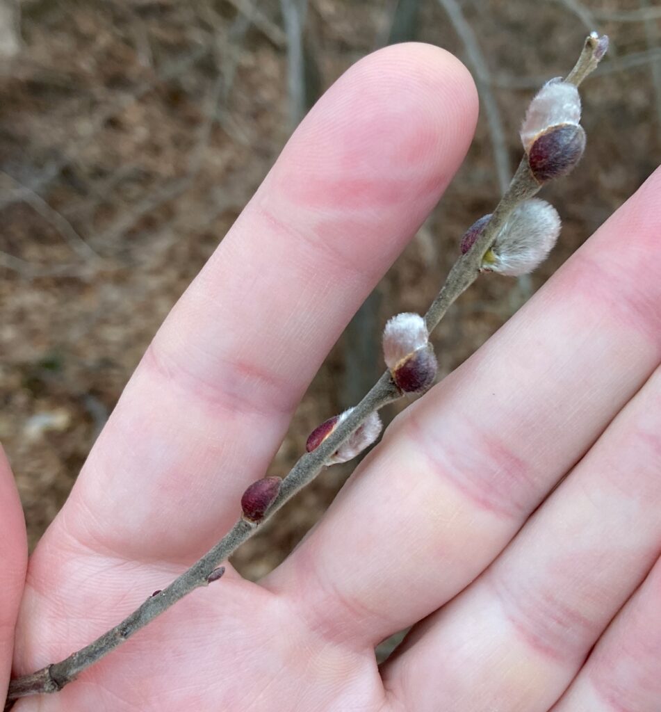 On my Sunday afternoon walk, I came across a small tree covered with little gray catkins just coming out on some of the twigs. We always called these Pussy Willows, presumably because the trees look like willow trees (Salix sp.), and the small emerging flower clusters, true to their name, look like small furry cats. This is the second native plant I’ve seen in bloom this spring.