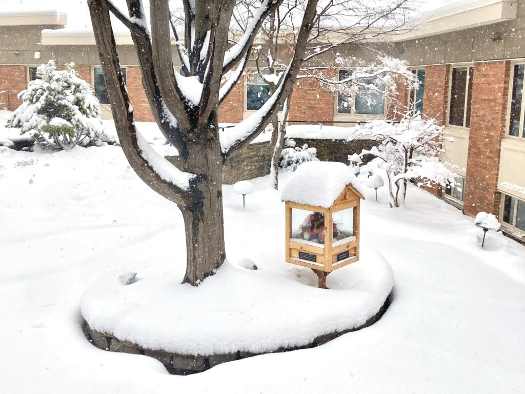 Some people here at the retirement community in Wisconsin measured up to 15 inches. But the temperatures are above freezing now, and the snow on Ed’s balcony is already starting to slump. People who live here are saying, “This is the last storm of winter. I hope.”