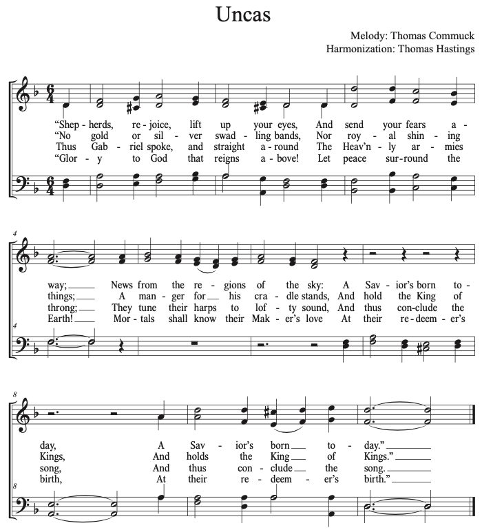 So here, for your Christmas pleasure, is Thomas Commuck’s Uncas. Commuck and Hastings put the melody in the tenor line (as was common in early American sacred song); I’ve switched their soprano and tenor lines, so that the melody is now in the soprano.