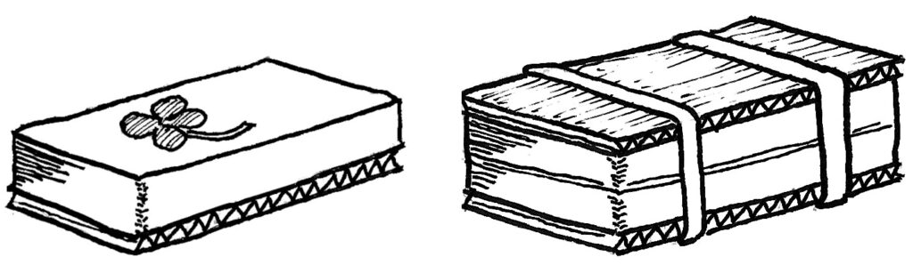 You’ll need fifty 3×5 file cards, two pieces of corrugated carboard cut to 3×5 inches, and two strong rubber bands. Place a flower in the middle of the stack of file cards. Put the rubber bands around everything (see the drawing). Let dry for a week or more. When dry, glue the dried flower to the index card using white glue.