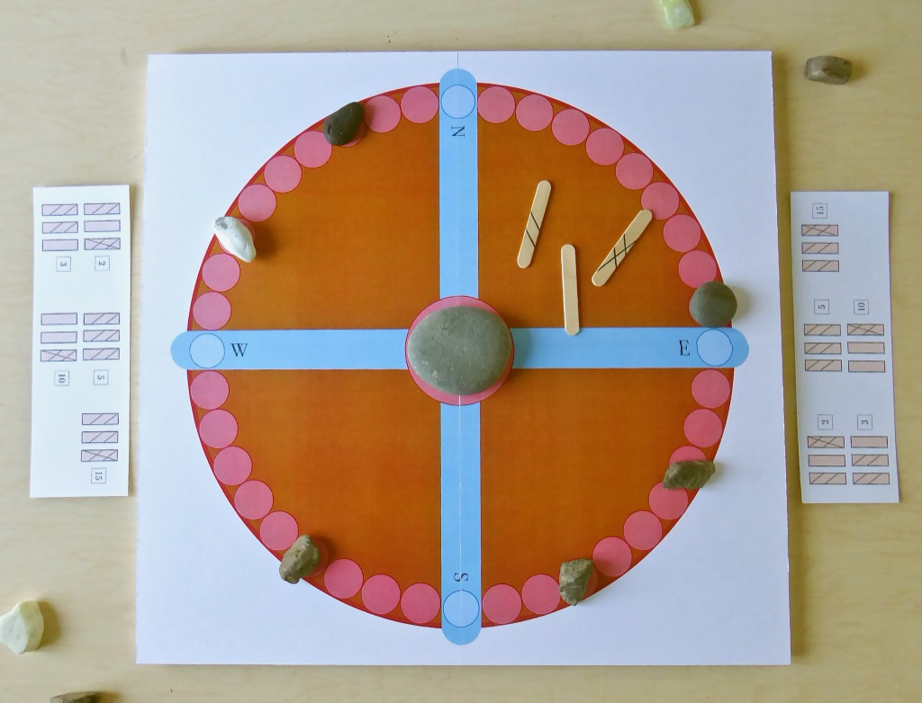 Making the game: According the the Macfarlans, the Indians used a game board of 40 stones arranged in a circles, with 4 gaps between the stones; the gaps are “rivers.” The design shown in the photo below reproduces this game board on paper; the blue stripes are the “rivers.” I printed the design in halves, on two 11 by 17 inch pieces of cardstock; then gluing the cardstock to foamcore to make a 17 by 17 inch game board. The counting sticks are popsicle sticks that are shortened; the sticks are marked (based on Tiwa Indian designs) as follows: all three sticks have two hatch marks on one side; two are left blank on the reverse side, while one is marked with three hatch marks on the reverse. A flattish stone goes in the center; this is to bounce the counting sticks off. I made two cards showing how to score the throws of the counting sticks. For playing pieces, I found some small stones, as you can see in the photo below; however, these were not very satisfactory, and I have since substituted colored game pawns.