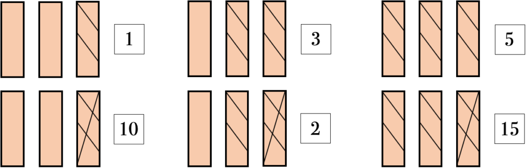 The diagram below shows how many points you get, depending on which sides of the counting sticks are showing. The player with the highest number of points goes first.
