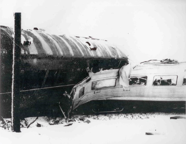 Sixty persons were injured when the Silver Budd Highliner smashed into the rear of a nine car diesel passenger train in a blinding snowstorm.