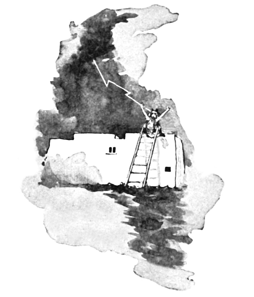 At last they came in sight of the big lake, and over it were great clouds, with the forked lightning leaping forth. They could see the evil Lake-Man sitting at the top of his ladder, watching to see if the boy would return, and as they watched the lightning of the True People struck him dead.