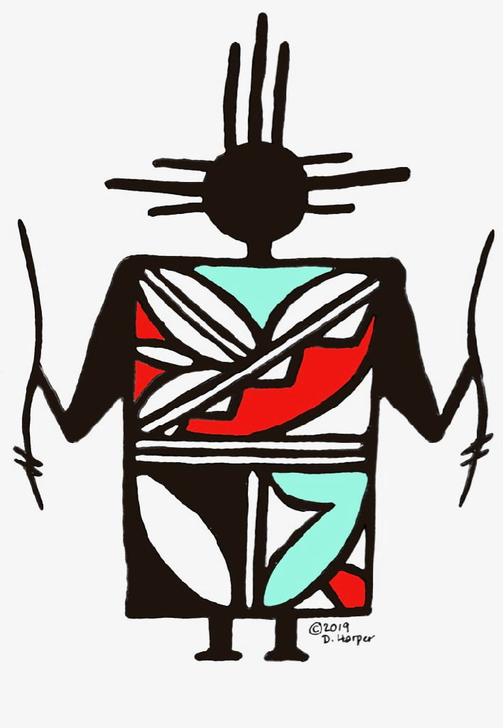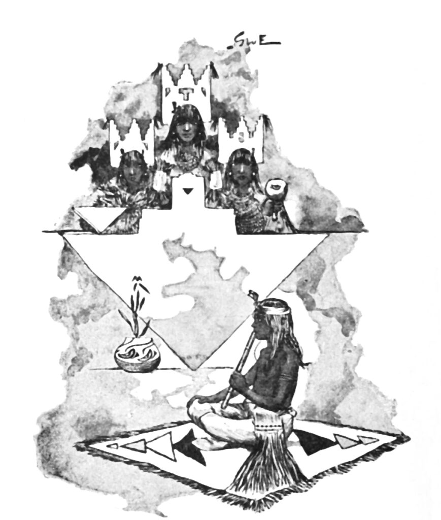 “Let him be brought in,” said the True People; and the guards brought the boy in through a magnificent building, until he stood in the presence of the True People in a vast room: white-colored gods of the East, blue gods of the North, yellow gods of the West, red gods of the South, and rainbow-colored gods of Up, Down, and Center. Beyond them were the sacred animals: the buffalo, the bear, the eagle, the badger, the mountain lion, the rattlesnake, and all the others that are powerful in medicine.