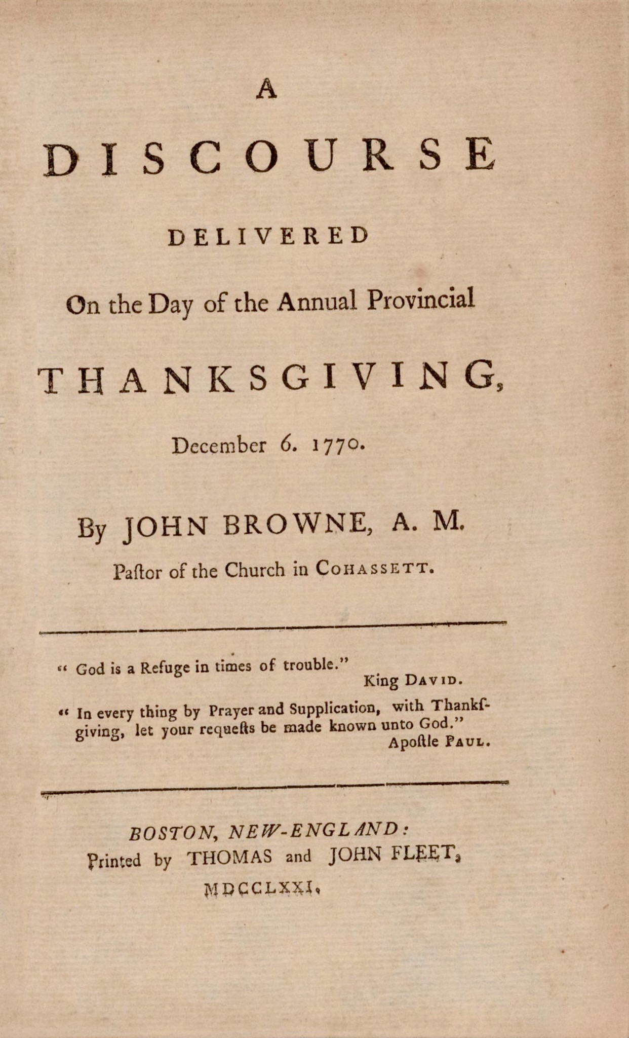 [Read by Holly Harris] The first reading comes from a sermon preached by Rev. John Browne to our congregation here in Cohasset on December 6, 1770. The sermon was titled, “A Discourse Delivered on the Day of the Annual Provincial Thanksgiving.”