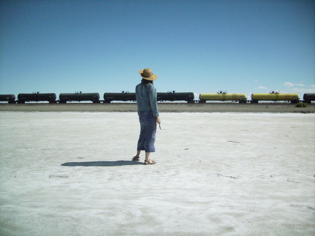 We had to stop at the Great Salt Flats rest stop, just over the border in Utah. While we were wandering over the salt flats, we watched as a west-bound Union Pacific train pulled into a siding while another UP train sped east on the main line.