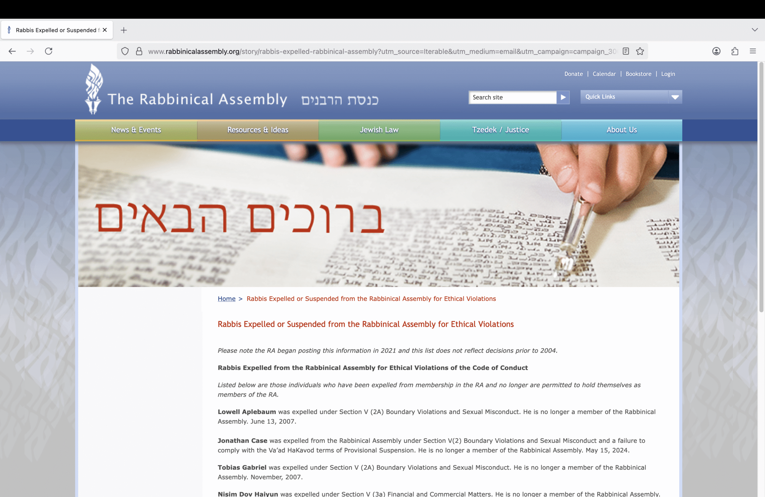 On this page, freely visible to anyone visiting their website, the Rabbinical assembly lists the names of seven rabbis who were expelled from the Rabbinical Assembly since 2004. This is exactly what should happen — if a clergy is expelled from a denomination of association of congregations, then the denomination-level website should make their names freely accessible in the interests of transparency.