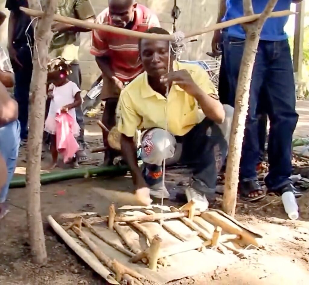 Screen grab from the Haiti video. The stick used to hit the string is blurred in this image.