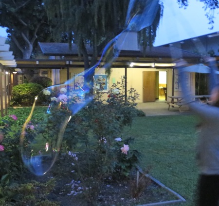 Above: A bubble made with this recipe. It was warm and very dry today so we had to wait until dusk to get really big bubbles. The bubble wand is made of two five-foot bamboo poles and a loop made of about 5 feet of 3/16″ cotton venetian blind cord with the nylon core removed.