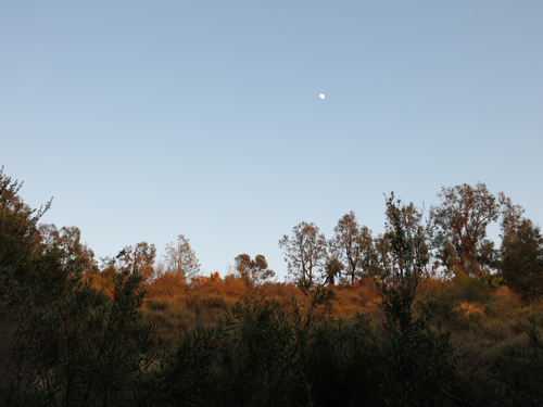 I’m in the Los Angeles area with my congregation’s youth group, headed towards Big Oak Canyon where we’ll be working at an ecology school. Tonight we’re staying at a motel in Irvine, and I went out for a walk to stretch our legs after the long drive. In amongst the malls and corporate office parks and suburban subdivisions, I found the Whiting Ranch Wilderness Area. I walked up Borrengo Canyon Trail, leaving behind the well-irrigated world of suburbia. I looked up, and there was the moon above the canyon: