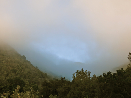 We camper overnight in Big Oak Canyon, which is a small canyon off Silverado Canyon. Sometime before dawn, fog rolled up Silverado Canyon, leaving a heavy dew on our sleeping bags. By 7 o’clock, you could look up the mountains behind our campsite and see blue sky starting to show in the sky above the ridgeline: