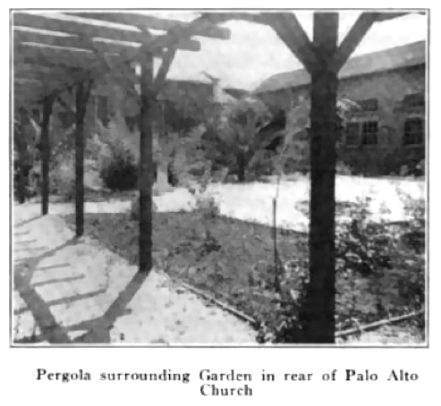 When the Unitarian Church of Palo Alto built their Social Hall during the summer of 1914, the minister worked out a plan to construct a pergola around the unoccupied part of the lot belonging to the church, and lay out the ground as a garden to be used as the meeting place of the Sunday-school in pleasant weather.