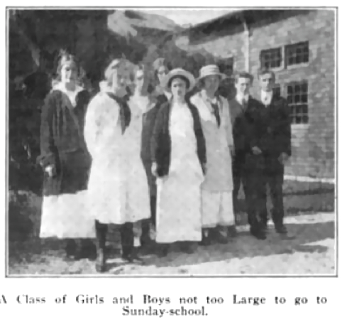 Finally Rev. Clarence Reed himself told of the growth of the Sunday School and the work of the society in general. The Sunday School is especially flourishing, the membership attendance having increased to between fifty and sixty, with a pronounced growth following the completion of the new hall and its adjacent garden.