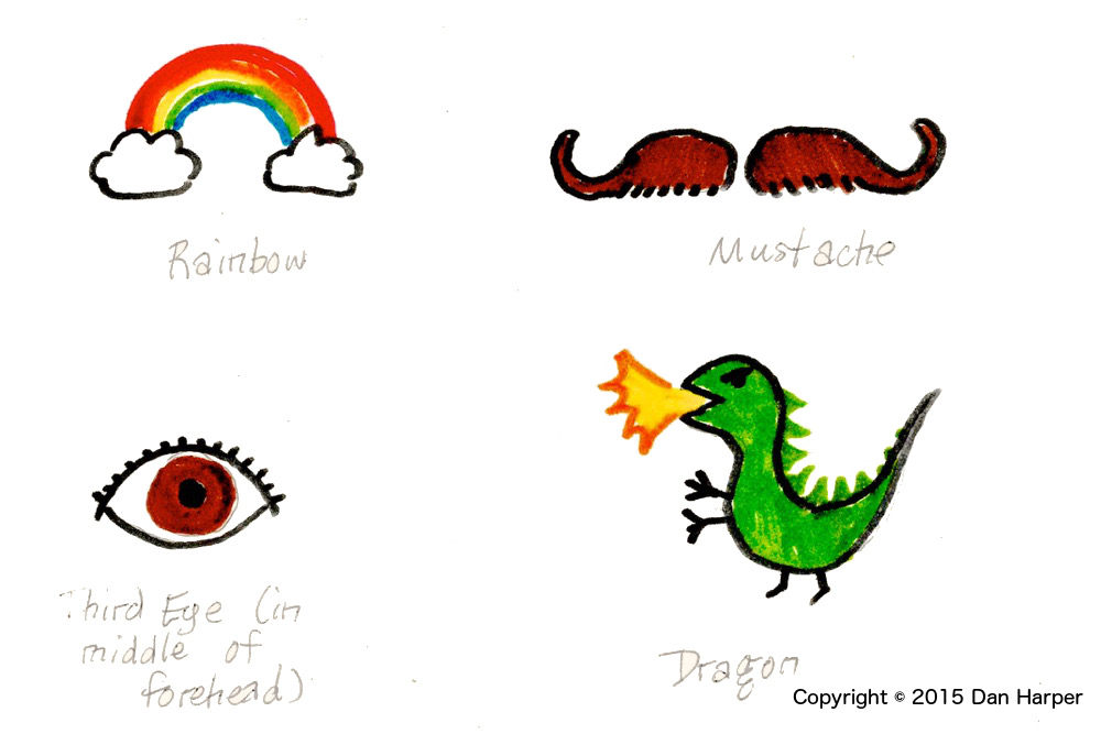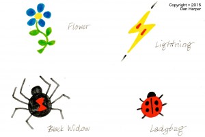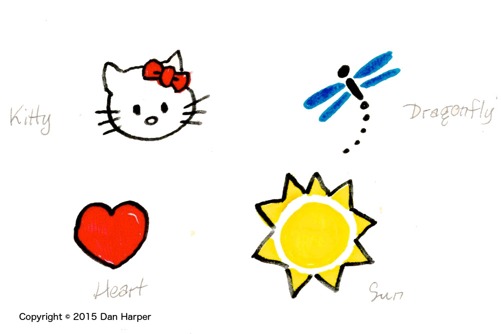 Our designs turned out to be easy enough that children can do them (we let some of the children who came to our booth use our paints to paint designs on each other) — yet they’re satisfying and look pretty good when you’re done. I’m posting them here in case you want to use them next time you do face painting in your congregation. Except where noted, our designs are meant to go on cheeks or backs of hands. We had copies of the designs where children could look at them and choose the one they wanted. One last suggestion: it is worth spending extra money for good face paints; we bought the cheap ones, but when Elaine let us try hers, we saw that they were far better.