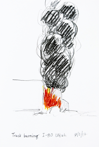 I got on the road at nine, but I wasn’t feeling completley alert, and I kept pulling over to get out and stretch. I tried listening to an audiobook of the Pickwick Papers, but I couldn’t stay focused. I listened to some Renaissance music for a while, then a field recording of old Sacred Harp singing, then Steve Reich, then John Coltrane — but each in turn quickly grew annoying. I tried singing the bass part of a duet I’m learning, but I skipped over a part then couldn’t remember the words. I stopped at one place to take a walk, but it was beastly hot, so I got back in the car and drove. I stopped for lunch at the rest area on the Bonneville Salt Flats. An hour later I stopped for a quick walk at Tempe Spring Wildlife Area, but the Black-Necked Stilts were aggressive and I soon saw why: shy young Stilts were hiding in the reeds, trying to be invisible; so I left. I stopped at a reservoir in Echo Canyon, only to realize that the column of black smoke I saw was a burning tractor trailer rig on the west-bound side of the highway, right over the road I drove under to get to the reservoir. I took a forty-five minute walk, and when I got back to the car the tractor was still burning, surrounded by fire trucks. Finally I drove into Wyoming, into self-proclaimed Big Sky Country — which weakly describes a landscape that makes human affairs feel tiny and insignificant — glad to put an end to this day.