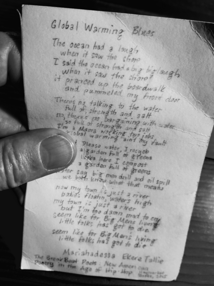 A couple of weeks ago, Carol and I went to the city and stopped in at City Lights Bookstore. I sat in the Poetry Room leafing through books and found the poem “Global Warming Blues” by Mariahadessa Ekere Tallie, in The BreakBeat Poets: New American Poetry in the Age of Hip-Hop (Haymarket Books, 2015). I almost bought the book, but I just got rid of four hundred books so we could fit into our new apartment; no way I could justify buying a new book for just one poem. So I performed the poem by writing out a fair copy on some watercolor paper. I tucked the poem into my coat pocket and forgot about it.