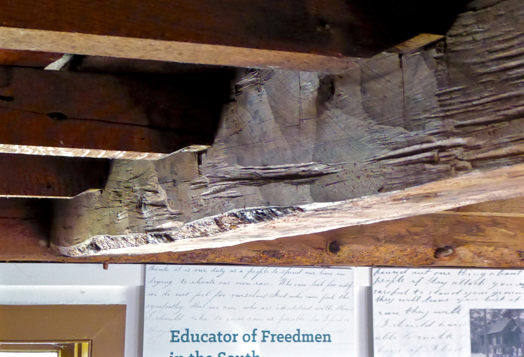 We got an excellent tour from one of the interpreters, who told us a great deal about the people who lived there, and about the social history surrounding the house. But I have to admit what interested me was the construction of the house. I was particularly interested in the exposed roof beams in one room, which included both hand-hewn beams and sawn joists. The sawn lumber was manufactured using a vertical saw, not a rotary saw. Why the mix of hand-hewn and sawn lumber? The hand-hewn beams could have been salvaged from an older structure, something that was often done in the early nineteenth century, or they could have been made for that house; the sawn lumber could have replaced older joists, or they could have been original, though sawn lumber would have been more expensive than hewing one’s own beams. When the house was being restored, there were archaeology, dendrochronology, and other architectural studies were carried out; I hope the non-profit organization that operates the house publishes the tests and tells us why there are two kinds of beams.
