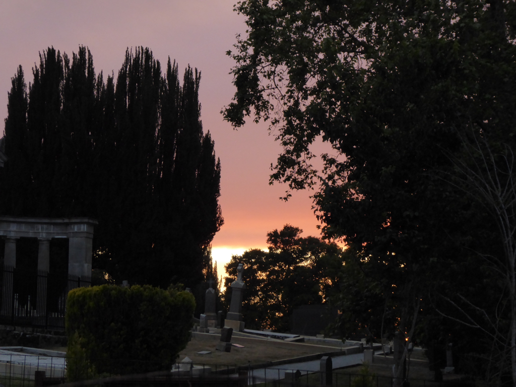 The past couple of evenings, the wildfires north of here have given us sunsets that are more colorful than usual. Tonight I went out and walked around the cemetery at dusk; the light was rosy with a yellowish tinge. I went up to where you can look out at San Francisco Airport, and watched a couple of jetliners land. A bank of fog was stretched from the Golden Gate across the Bay towards Oakland; an avalanche of fog curled over the top of San Bruno Mountain; here in San Mateo, the fog was several hundred feet above me, pushed upwards as it moved up the Crystal Springs Gap. Then I happened to look up, and there was a pair of White-tailed Kites hovering overhead, silhouetted against the bright low clouds; they worked their way down the hill, and for a few minutes I watched them come to a hover every minute or so, until they disappeared farther down the hill behind some trees. The rosy glow from the sunset really was lovely, even with the realization that a good bit of that lovely redness came from wildfire smoke.