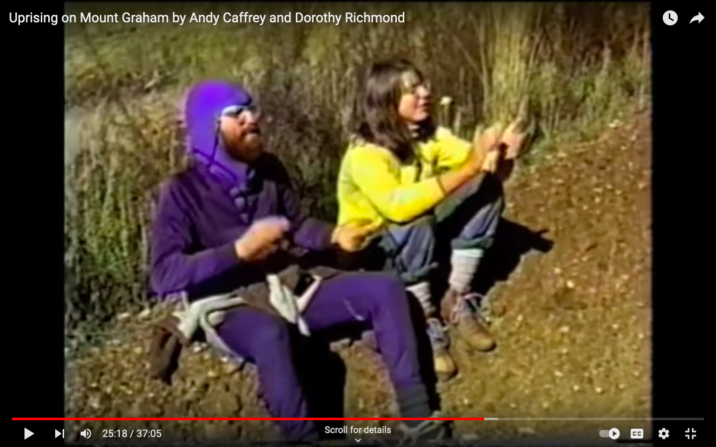 Gabriel, thanks, this is a super useful piece of evidence. I’ll include a screen grab from the video of the two people singing the chant. The video is a short film titled “Uprising on Mount Graham” by Andy Caffrey and Dorothy Richmond — film info on IMBD here: https://www.imdb.com/title/tt2368786/ The construction of the Mount Graham observatory received construction permits in 1988, and the film was released in 1990, so that narrows down the date of filming to between 1988 and 1990.