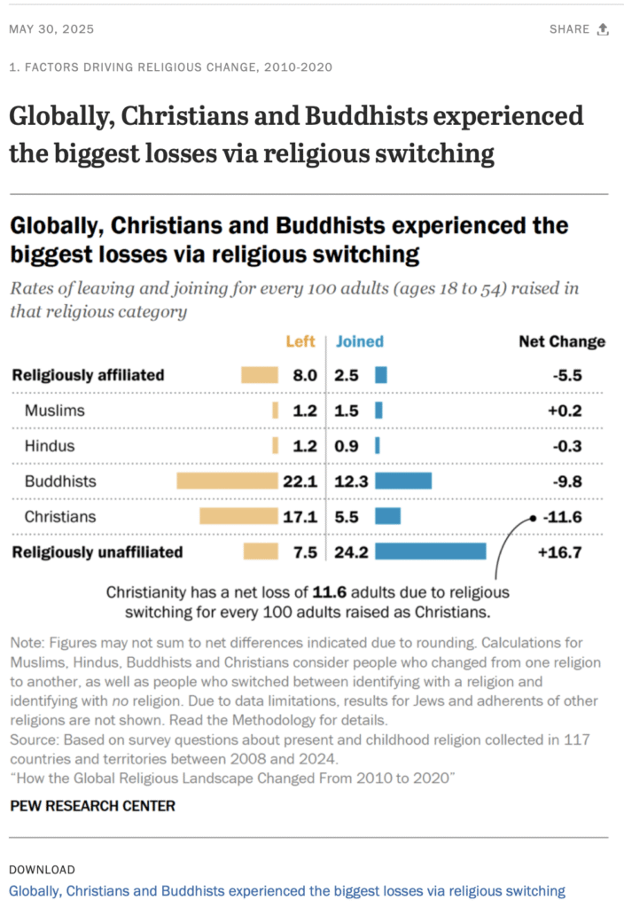 Unfortunately, The Economist neglects to tell us which three surveys report this decline (sadly typical of their reporting). A survey by Pew Research is probably one of them. On January 24, 2024, Pew Research published an online report titled “Religious ‘Nones’ in America,” in which they document a drop in the number of Nones from 2022 to 2023. However, in an analysis published the same day, Pew Research felt that it was “too early to tell” whether drop was significant. In another article published this year, on June 9, Pew Research detailed global religious decline from 2010 to 2020. One of the things they looked at was which religions suffered the greatest losses via “religious switching,” i.e., people switching to another religion or switching to no religion at all. Based on global surveys conducted from 2008 to 2014, Pew found that the biggest religious losers were Christianity (-11.6%) and Buddhism (-9.8%); the biggest gainer was no religious affiliation (+16.7%).