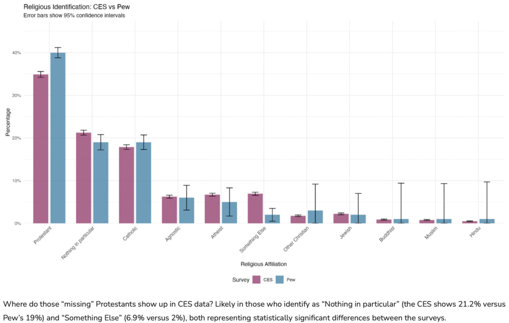 The Cooperative Election Survey (CES), housed at Harvard University, also asks questions about religion, and serves as another good source for data on religious affiliation. The CES tracks the Pew Research surveys within a few percentage points. But there are some curious differences. CES finds 5.1% fewer Protestants than Pew does. There’s also a significant gap in those reporting as “Something else” — which is probably what many Unitarian Universalists would report themselves as.