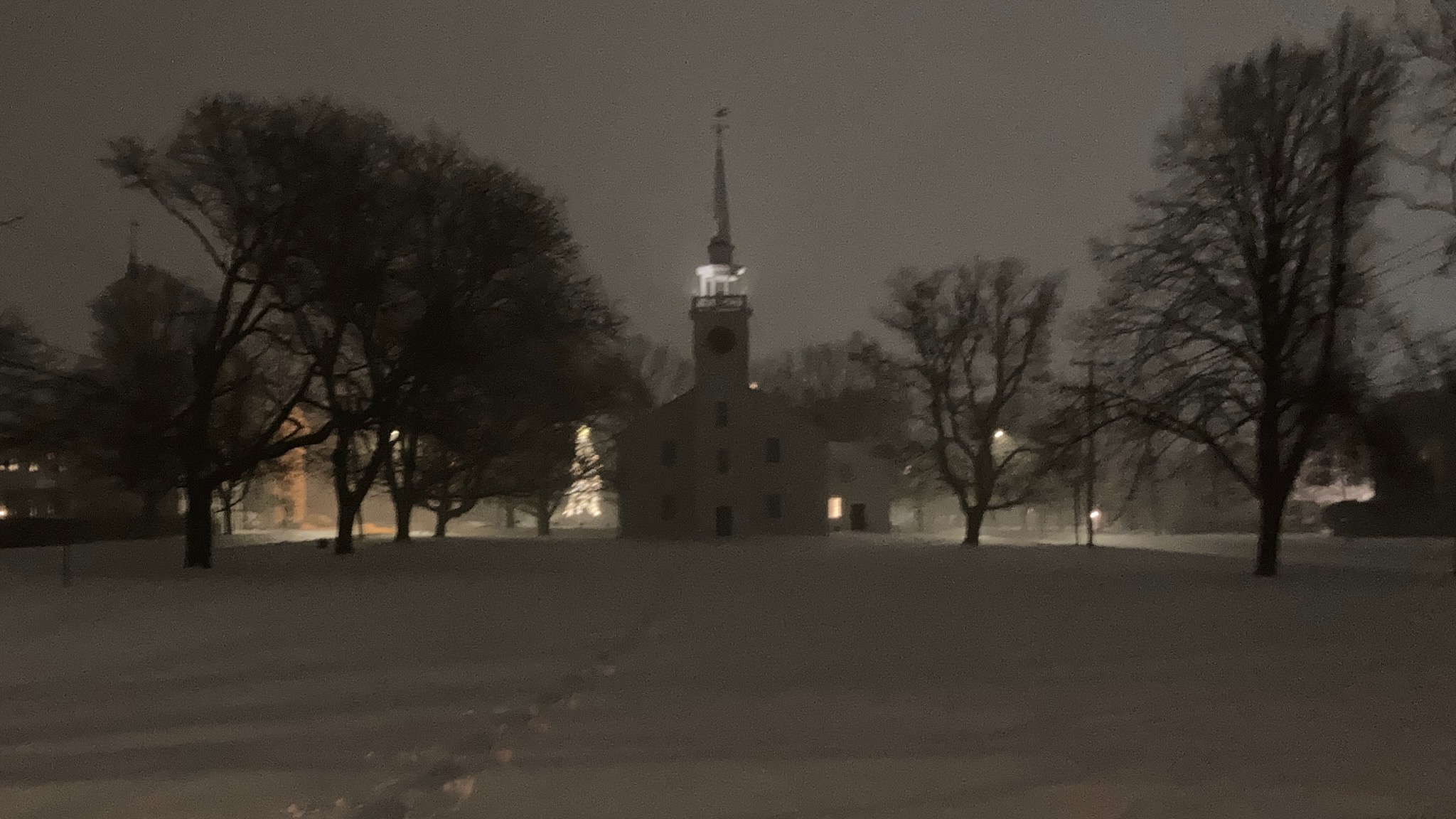 The Common was quite beautiful. A few kids were sliding down the hill that St. Stephen’s church is on, and the occasional snow plow rumbled past. Aside from that, no one else was out. Lights were on in nearly all the houses around the common, making it look cheerful in spite of the gusty winds.