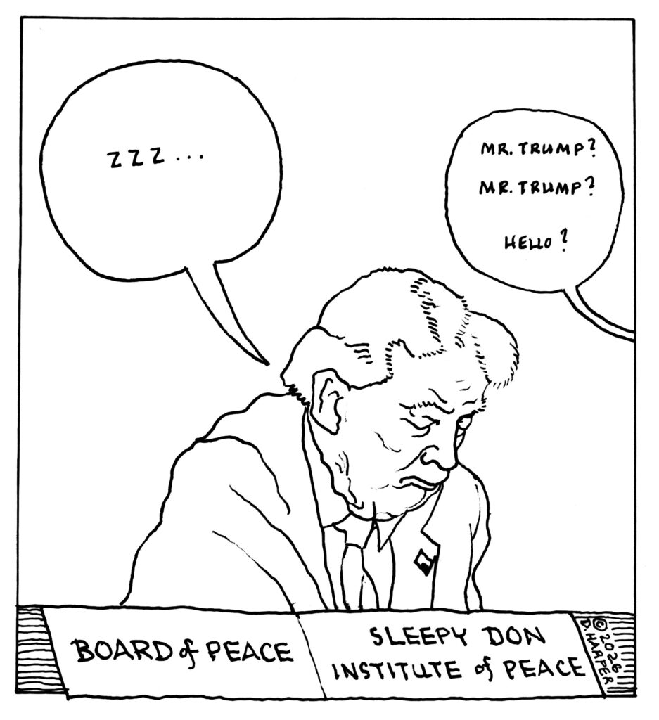 News item: “President Trump has once again dozed off on camera at his own event. Footage shows Trump looking extremely drowsy at his inaugural ‘Board of Peace’ meeting on Thursday at the U.S. Institute of Peace in Washington, D.C.”