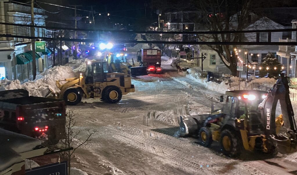 Our neighborhood, known as Cohasset Village, is a business district with on-street parking. The huge snow piles lining the streets took up much of the parking. So tonight, town employees and contractors are here in the Village with one large tractor with a bucket loader, three medium-size bucket loaders, one of those little mini bucket loaders, several police cars, and a long line of dump trucks. The little bucket loader climbs up on the sidewalk and pushes the snow into the street. The medium size bucket loaders carry the snow to a central collection point, the junction of Elm and Main streets, two doors down from our apartment. Then the big bucket loader scoops the snow into the waiting dump trucks, as one by one they drive up, get loaded, and drive off again. Our second floor apartment is the perfect place to watch the action.