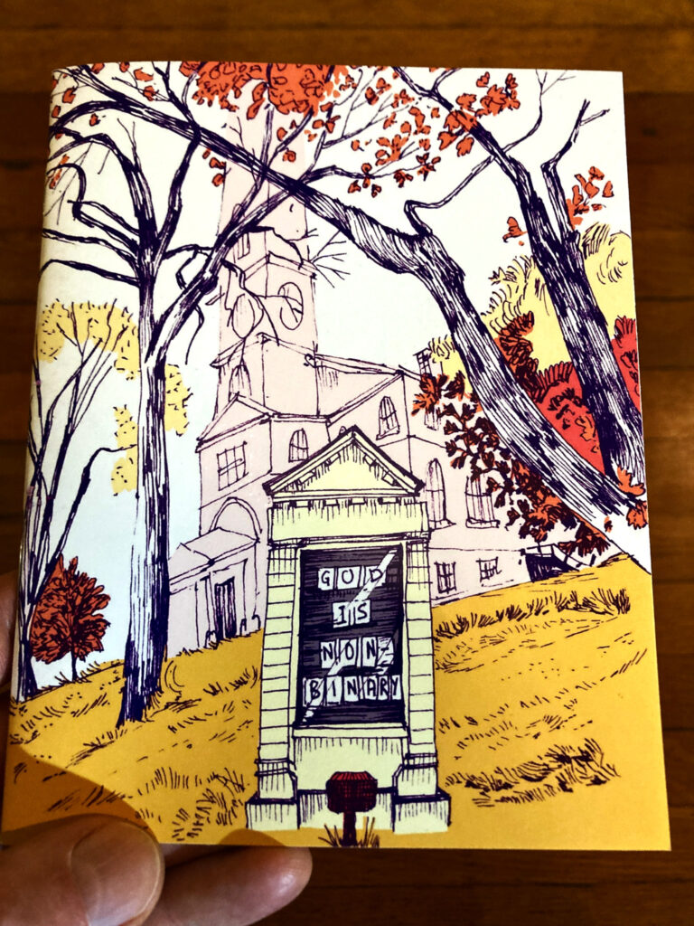 As the keeper of the Wayside Pulpit outside our meetinghouse, I was jealous when I learned that people actually talk to Washam about the things she puts in her Wayside Pulpit. But then, her Wayside Pulpit is edgier than ours is. I put up sayings like “The moral arc of the universe is long but it bends towards justice.” No one comments on things like that. When Washam put up the phrase, “God Is Non-Binary,” sixteen people made comments: