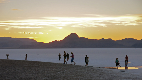 We watched the shifting color, but we also watched the dozens of people who pulled their car or truck or RV into the rest area, and leaped out, camera or smartphone in hand, to take as many photos as we were taking. A family group came out of two rental RVs speaking Polish, children running across the slat flats, adults staring and taking photo after photo. A trucker walked swiftly to the edge of the slat flats, holding up his smartphone to take photos. And off to one side, half a dozen people took part in some kind of photo shoot: a woman in a long red dress, a girl holding a bright pink helium balloon, a photographer with a backpack and cameras slung around the neck.