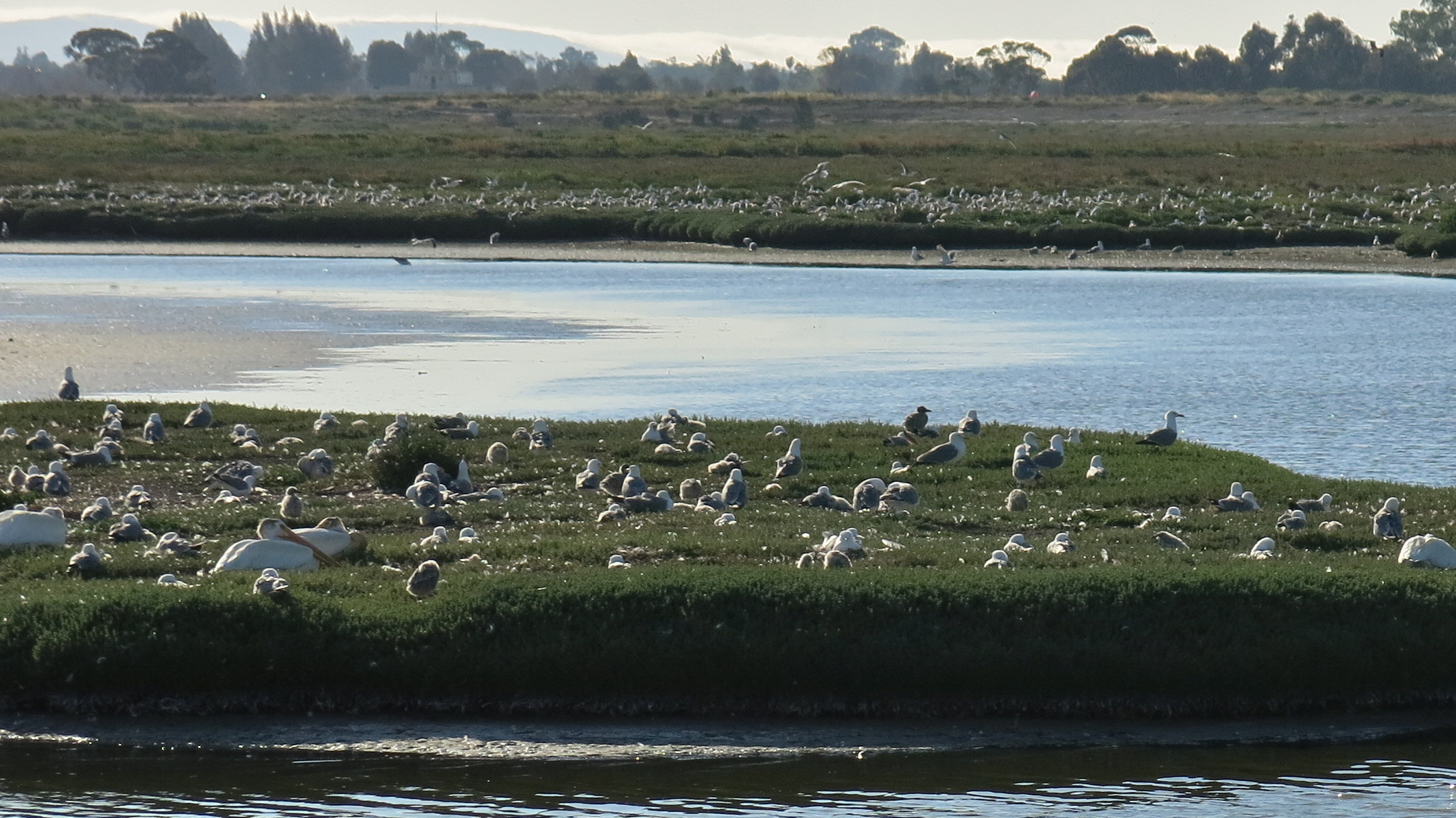 But something that happened in the afternoon made the rest of the day bearable. I was taking a break from checking email, and walked out to the edge of UUCPA’s campus to look down into Adobe Creek, which is routed into a large concrete channel for the last mile or two before it reaches the Bay. By fall, there’s always sediment that has accumulated during the summer, when not much water flows through the channel. This year, there was a luxuriant growth of what was probably water cress, and the last rain had been enough to cut some winding channels through the greenery, without washing everything down stream. The usual Mallards were paddling around, and then I noticed a Snowy Egret crouched behind a thicket of greenery; it lashed out with its bill, and appeared to spear something from the water.