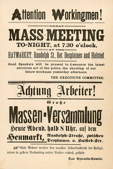 Everywhere else in the world, Labor Day is celebrated on May 1. But not in the United States. May 1, 1886, was the date of a general strike throughout the United States for the right to an eight hour day: “Eight hours for work, eight hours for sleep, eight hours for what we will.” In Chicago, the strike continued through May 3, where as many as 80,000 workers stopped work. Though the workers were peaceful, the police were not — on May 3, they fired on striking workers, killing at least two workers. So a mass rally was arranged for the next day, May 1, in Haymarket Square.