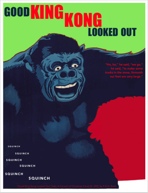 It is a rare song that’s appropriate at both Christmas and Hallowe’en season, but the much-beloved “Good King Kong Looked Out” (from A Consort of Christmas Carols by P.D.Q. Bach [1807-1742]) is one such carol. The thought of good King K. squinching through the snow made me want to illustrate this traditional carol, using much-modified public domain images….