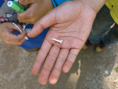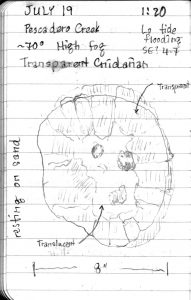 As we followed the creek upstream under the Highway 1 overpass, Carol noticed that there were dozens of jellyfish washed up along the high tide line, translucent organisms looking a little like plastic bags filled with water. Most of the organisms were damaged; some had obviously been stepped on, some appeared to have broken in pieces, some no longer had a definable shape. I walked closer to the water, and began to find a few organisms that looked less damaged; one in particular, shown in the photograph below, retained a good deal of its structure: