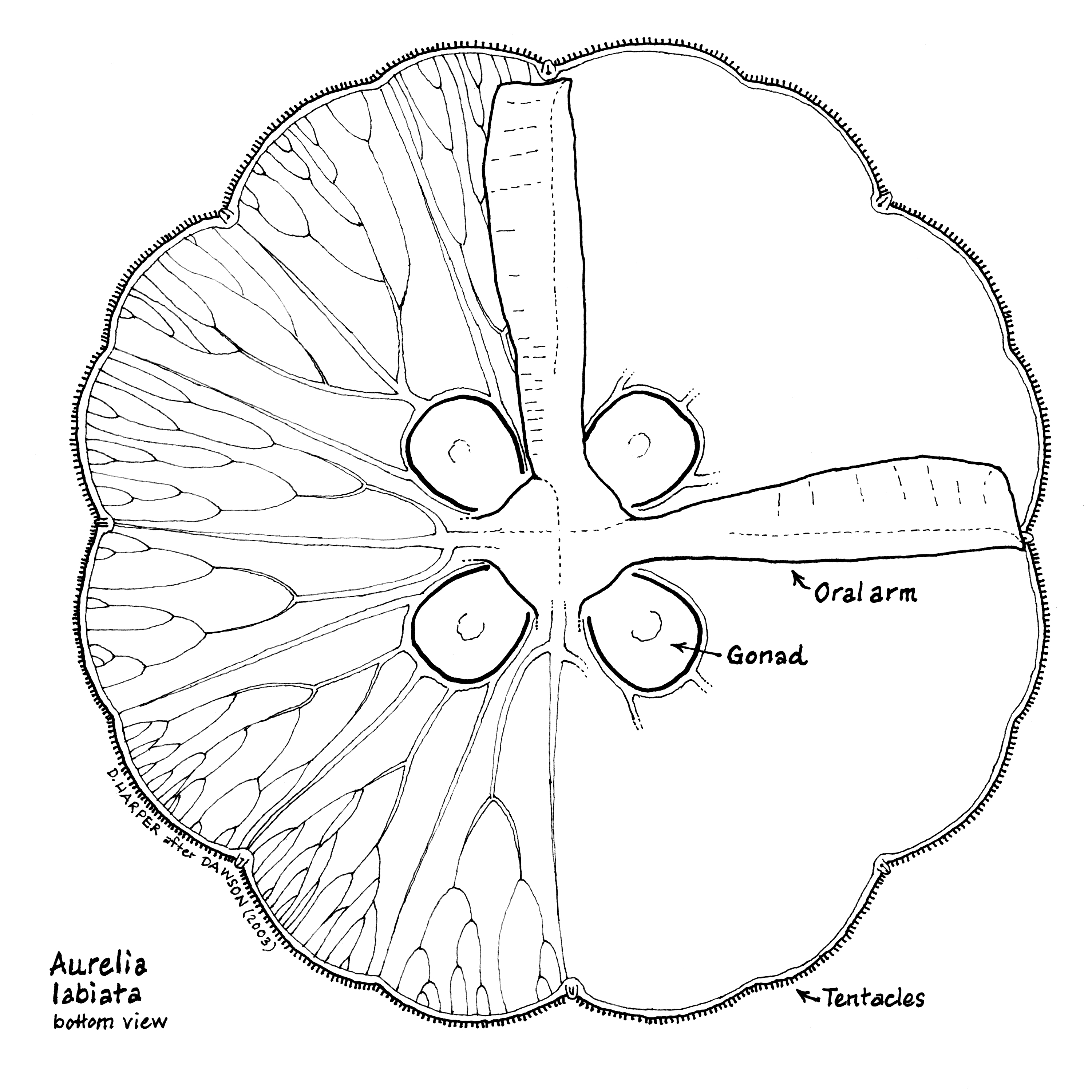 Note on my drawings: In making the drawings, I began with the cited sources, then consulted various online photos identified as Aurelia labiata. I saw significant variation in online photos, especially as regards tentacle length; since my drawings are not made from living specimens, they should be taken as schematic drawings, not accurate representations of live individuals.