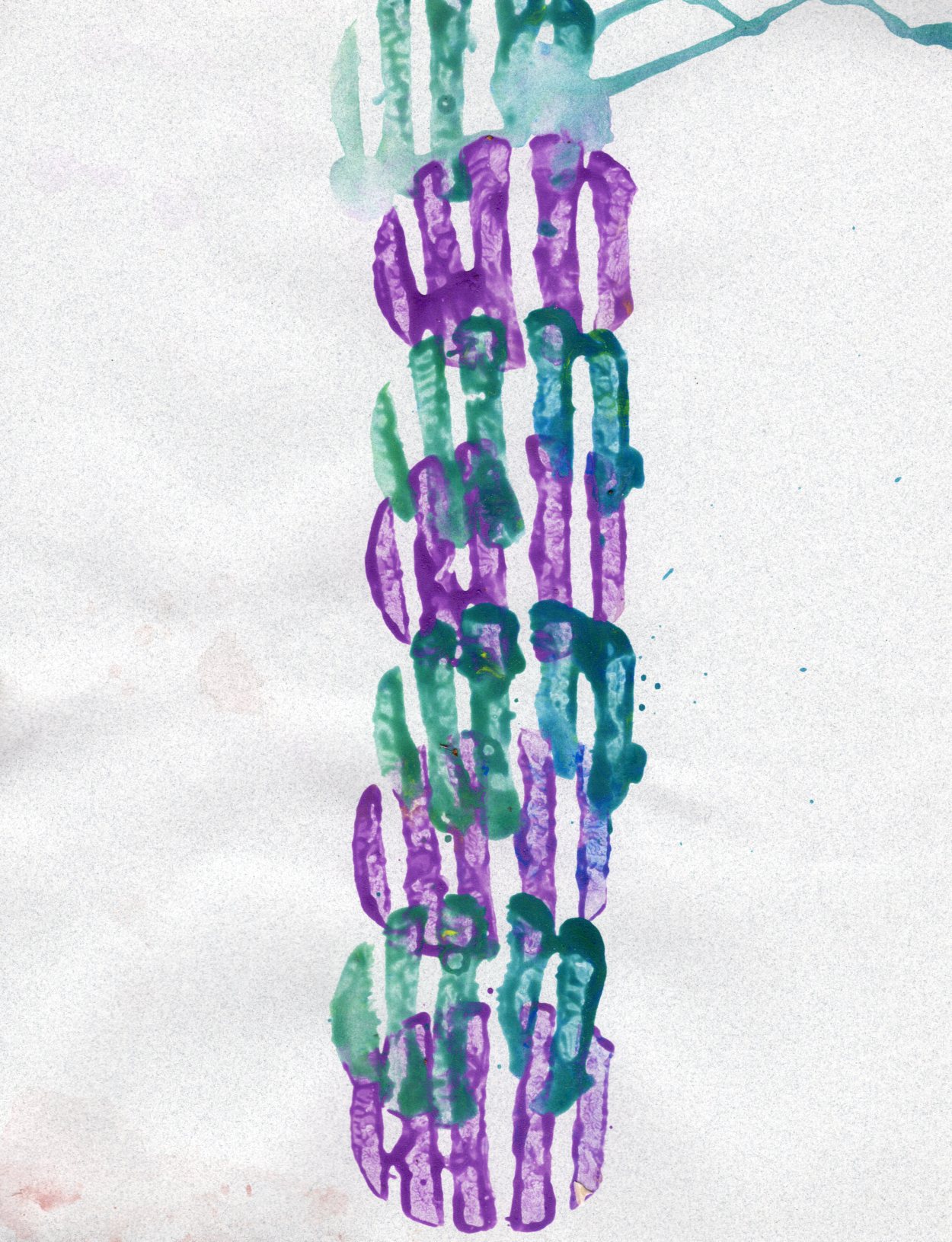 We taped large sheets of paper on two tables, and provided red, yellow, and blue tempera paint. The children enjoyed mixing their own colors, then spreading the colors with the natural paintbrushes.