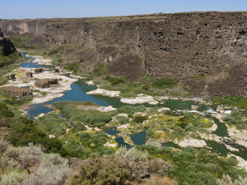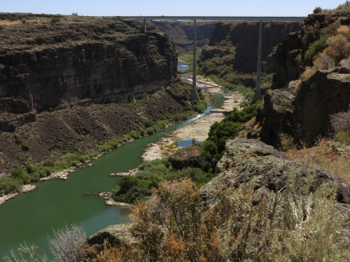I followed a sign pointing to Shoshone Falls, and pulled over at the Hansen Bridge overlook. The view from the little parking area was dramatic — the bridge crossing a nine hundred foot wide canyon some four hundred feet above the Snake River. I thought that maybe if I kept walking on the adjacent Bureau of Land Management property, the view up the canyon towards the bridge would be even more dramatic, and it was. I climbed down and out on the volcanic rock of the canyon rim and watched Swainson’s Hawks and Red-tailed Hawks circling far below me, startling flocks of Rock Pigeons roosting in holes in the cliffs as they circled past.