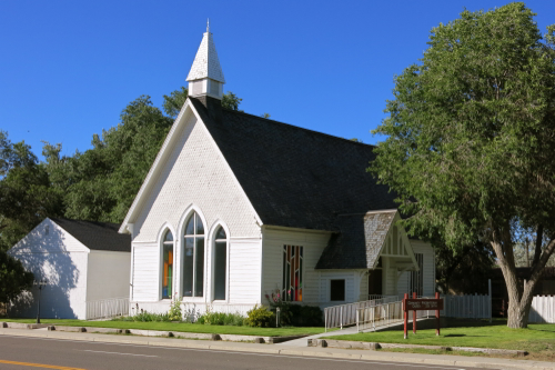 In Wells, Nevada, I stopped at the Emigrant Trail Center, and talked with the volunteer who was staffing it today. He had grown up in Wells, which began as a railroad town — his parents worked for the railroad — and when the railroad reduced its operations in the late 1960s, jobs shifted to supporting the new interstate highway that came through town. The ranchers in the area, he said, also contributed a good deal to the local economy. After the earthquake of 2008, which destroyed many of the old historic brick buildings in the town, a vein of gold was discovered, and plans are now being made to mine that vein — which, he hoped, would add more jobs to the local economy. On my way out of town, I stopped to take a picture of the Community Presbyterian Church, which — so said my friend who grew up in Wells — had stood for more than a century, pretty much unchanged.
