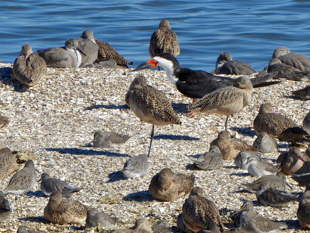 While my laundry was in the machines at the laundromat, I took a walk along the bay. High tide pushed the shorebirds in close to the bike path, so it was easy to sort out dowitchers, Willets, Marbled Godwits, and Black-bellied Plovers. There were also half a dozen Black Skimmers spaced out along the water, each one making a striking contrast to the mixed flock of shorebirds.